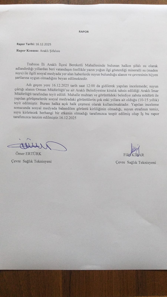 Trabzon – Trabzon’un Araklı ilçesine bağlı Bereketli Mahallesi’nde bulunan ve halk arasında “şifalı su” olarak bilinen mineralli su kaynağı hakkında sosyal medyada ortaya atılan “mikrop saçtığı” ve “çevresinin kirli olduğu” iddialarına resmi kurumlar inceleme raporu ile cevap verdi.