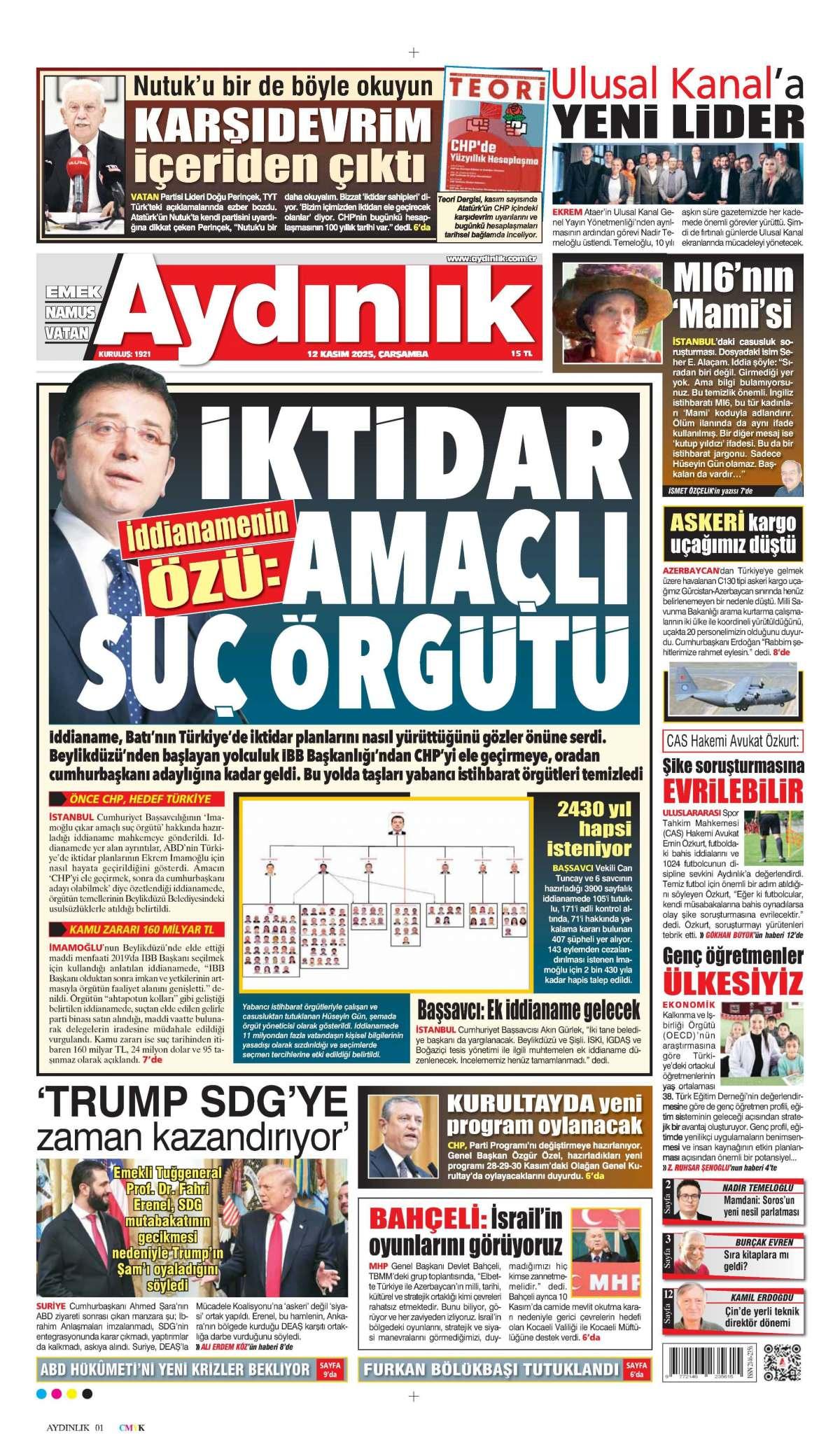 Aydınlık Gazetesi 12 Kasım 2025 Günü Gazete Manşetleri