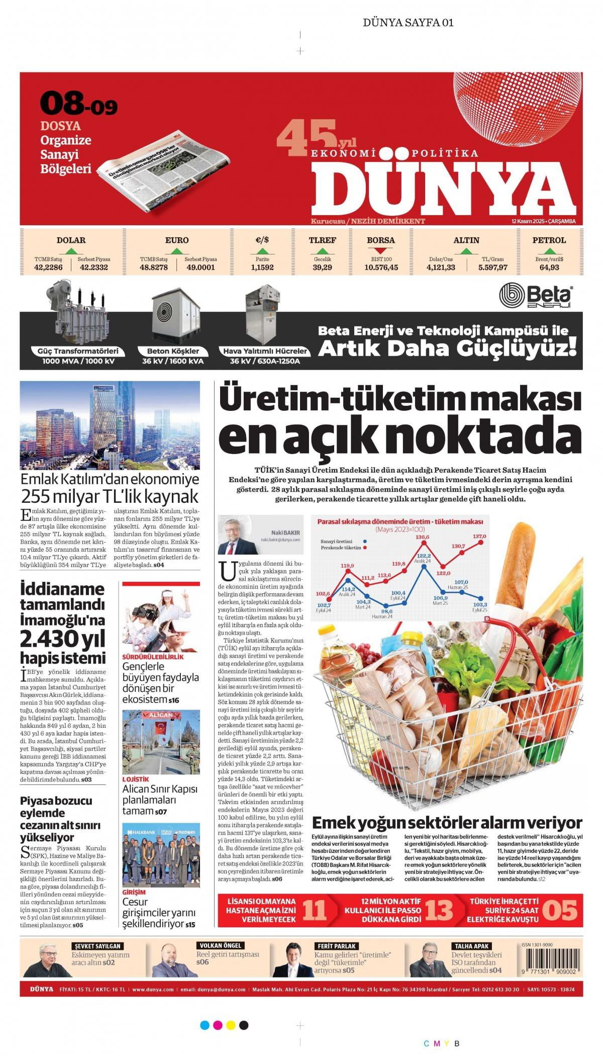 Dünya Gazetesi 12 Kasım 2025 Günü Gazete Manşetleri