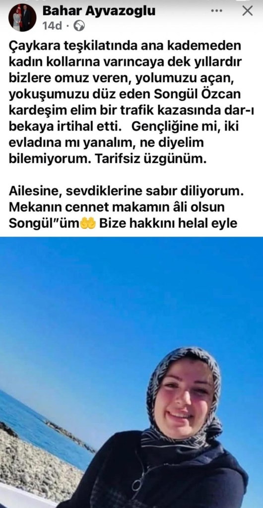 Trabzon Çaykara AK Parti Kadın Kollarında görevli Songül Özcan Çaykara’da Meydana gelen Trafik Kazasında Hayatını kaybettiği öğrenildi.